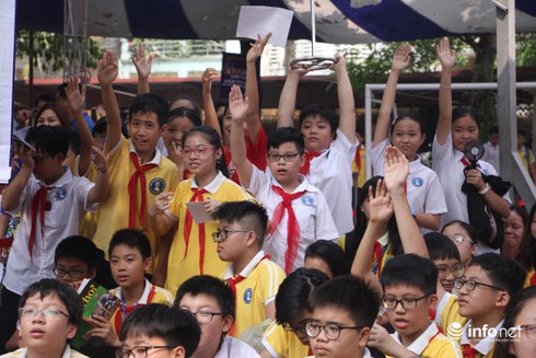 Rất nhiều cánh tay của các em học sinh trường THCS Nguyễn Trường Tộ xin được hỏi các cầu thủ.