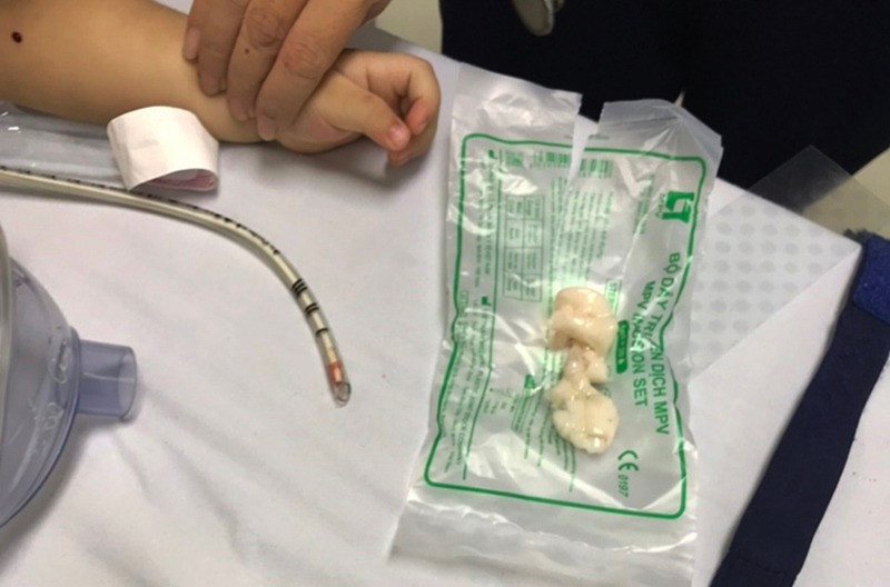 Theo đó, khi bé trai 2 tuổi đang ăn thạch thì bị sặc dẫn đến tím tái toàn thân. Người nhà lập tức đưa đến bệnh viện trong tình trạng hôn mê sâu, ngừng tim, ngừng thở. Các y bác sĩ của Khoa Cấp cứu lập tức tiến hành hồi sức tim phổi kèm lấy dị vật đường thở.