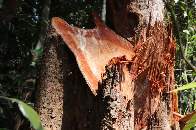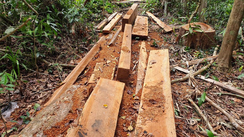 Cụ thể, có 18 cây gỗ mới bị đốn hạ, hàng chục cây khác đã bị lâm tặc cưa xẻ từ trước chưa kịp vận chuyển ra khỏi rừng. Nhiều cây cổ thụ 2-3 người ôm bị xẻ thành từng phách đem ra khỏi rừng, nhiều phách gỗ mới chưa kịp vận chuyển ra ngoài thì bị phát hiện.