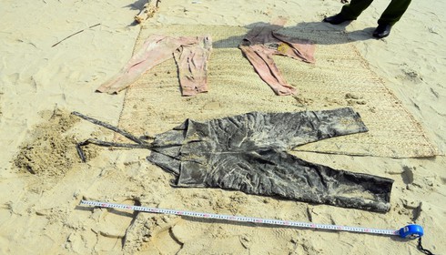Trang phục trên thi thể trôi vào bờ biển ở xã Tam Tiến. |