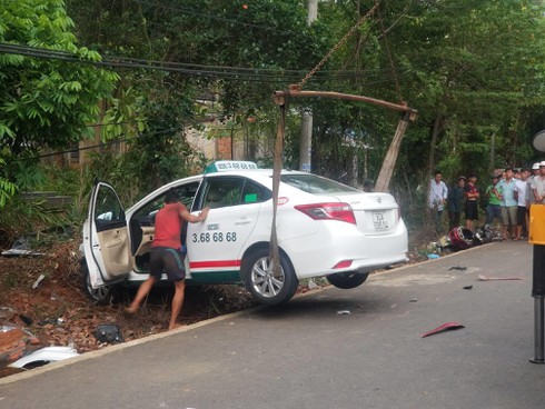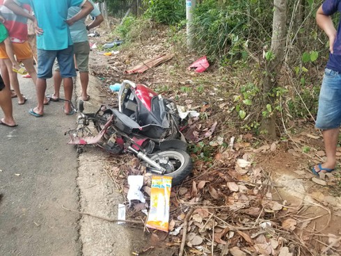 Theo ghi nhận tại hiện trường, xe taxi lao vào vườn cây bên đường, nát phần đầu, cách đó khoảng 3m, chiếc xe máy biến dạng hoàn toàn.