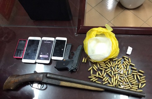 Kiểm tra trên xe, tổ công tác phát hiện có 01 khẩu súng nhãn hiệu RG88 màu đen, trong hộp tiếp đạn có 03 viên đạn; 01 khẩu súng Rulo 2 nòng tự chế báng gỗ khoảng 70cm; 105 viên đạn súng quân dụng; 01 túi Nilon khoảng 400g chất tinh thể màu trắng nghi là ma túy đá.
