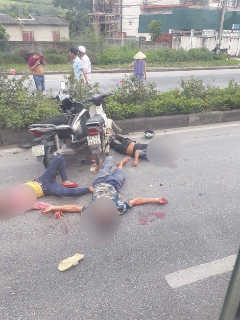 Cú đâm mạnh khiến phần đầu của hai chiếc xe bị biến dạng và 3 người ngồi trên hai xe máy văng xuống đường bị thương nặng. Sau đó, cả 3 nạn nhân được đưa đến bệnh viện cấp cứu.