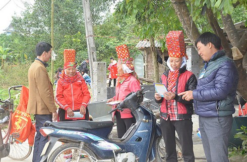 Cán bộ các thôn, bản tuyên truyền, hướng dẫn cho bà con dân tộc về Luật giao thông và chấp hành đúng các quy định khi tham gia giao thông (Ảnh: QN) |
