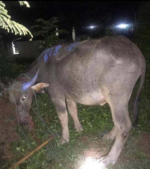 Hiện con trâu đang được người dân xã Tân Long trông giữ để chờ người đến nhận.