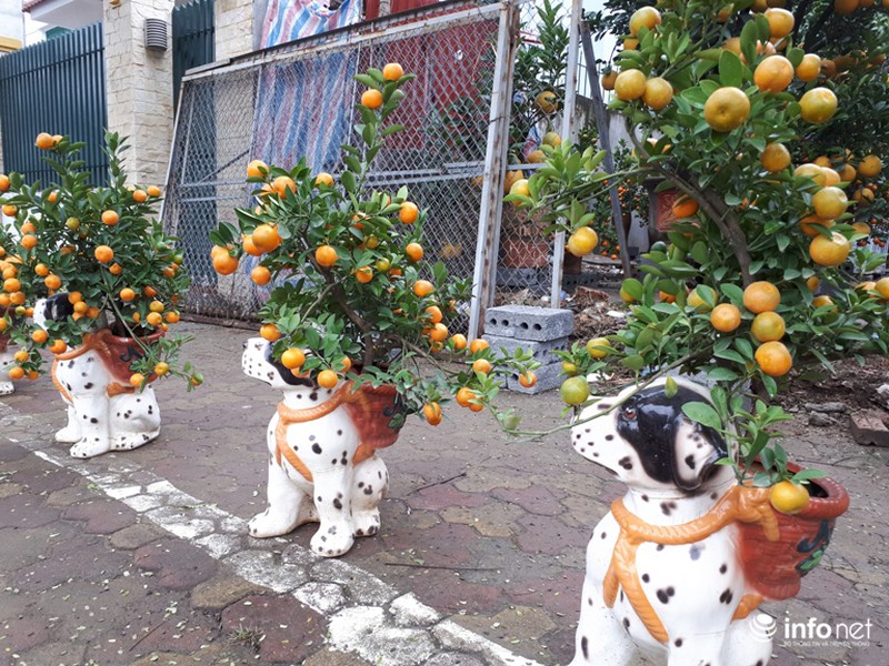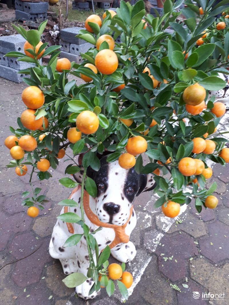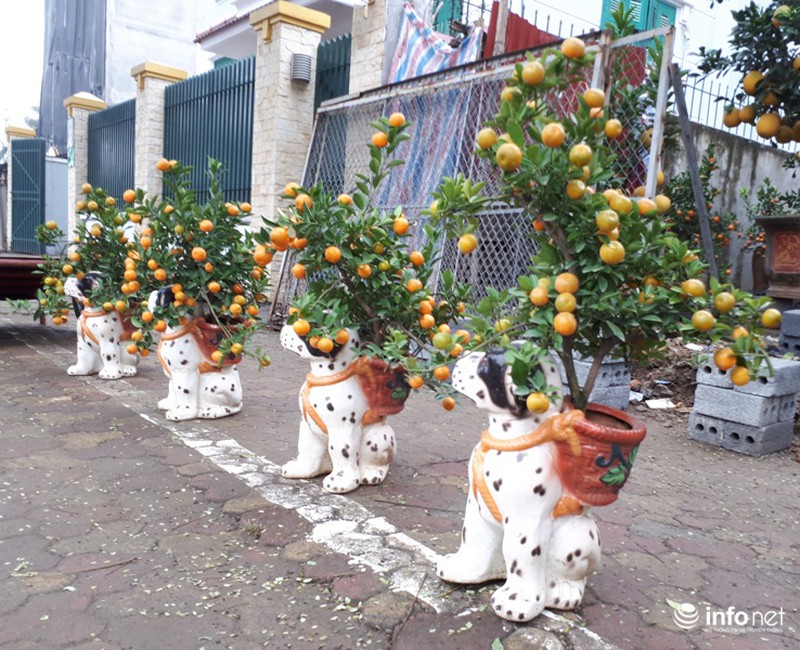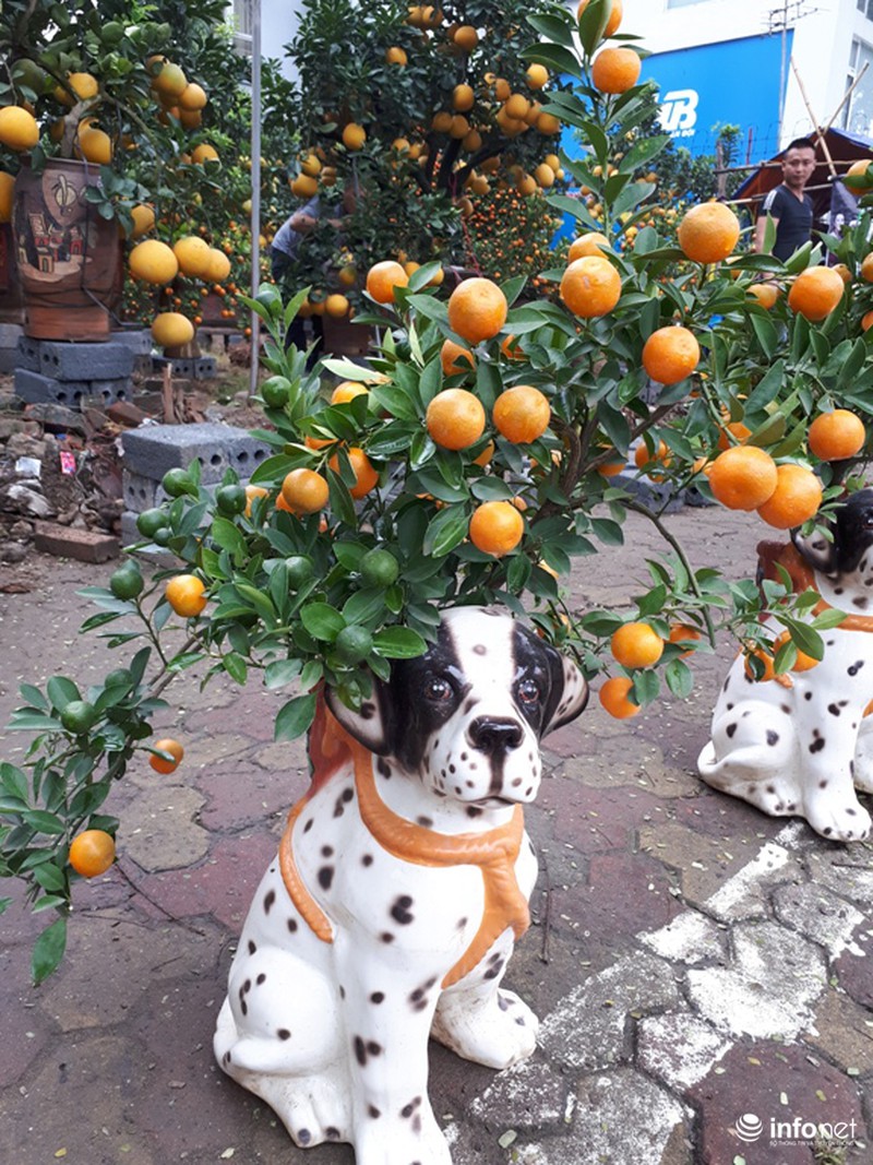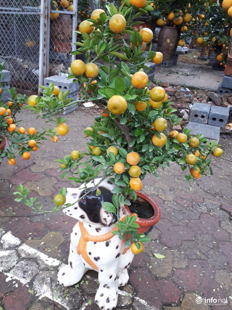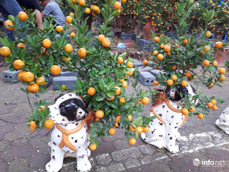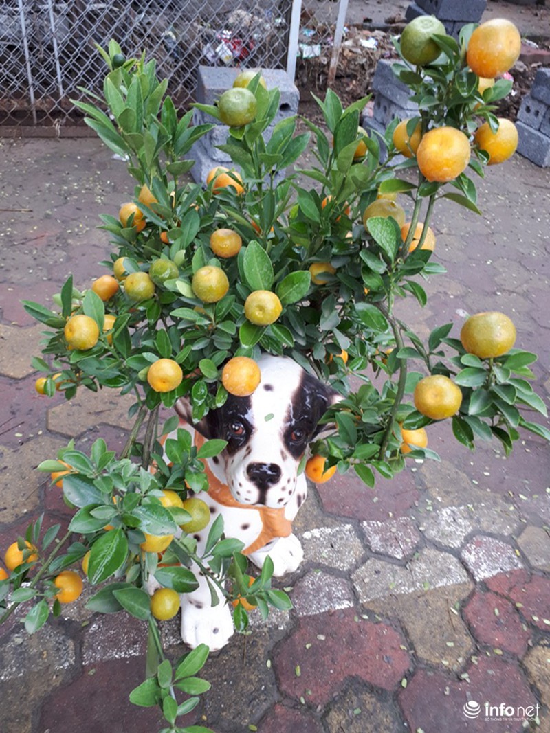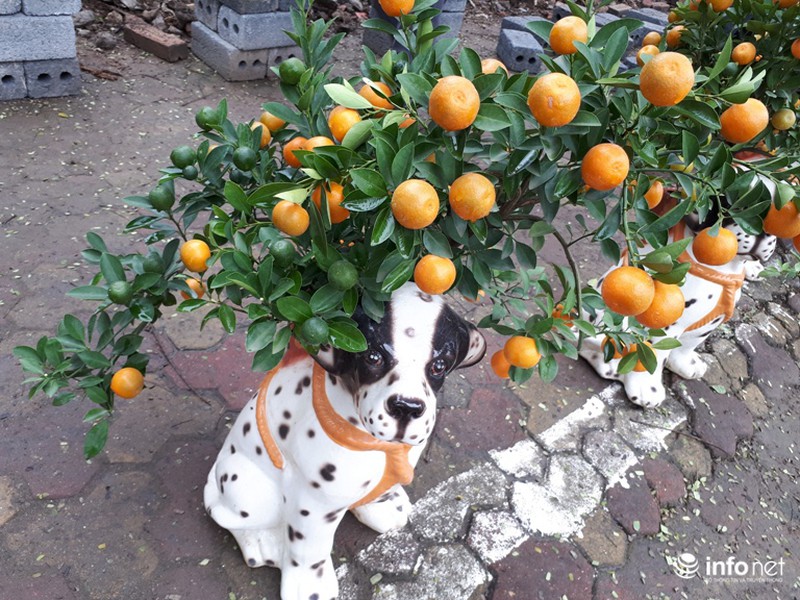 Ngoài ra, do năm nay là năm Mậu Tuất nên rất nhiều quất được tạo thế trồng trong những chiếu chậu hình chó đốm như thế này. |