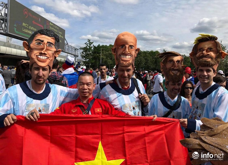Người đưa Quốc kỳ Việt Nam tới World Cup chụp ảnh cùng các CĐV Argentina trước giờ khai mạc. |