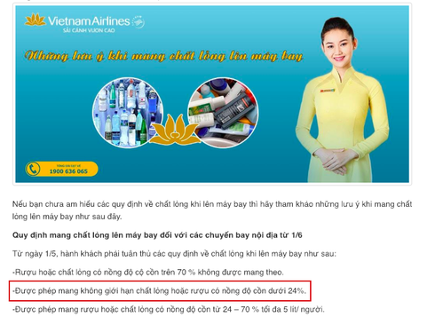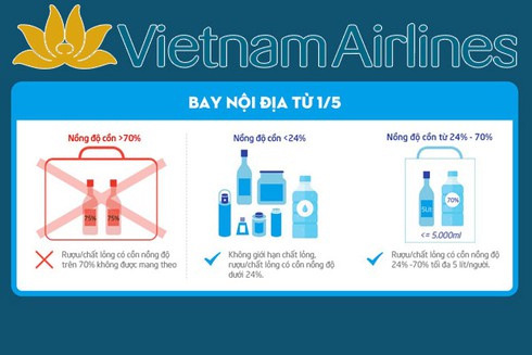 | Đối với hành khách đi trong các chuyến bay nội địa: Tuy nhiên, bạn vẫn phải đảm bảo trọng lượng, cân nặng tối đa cho phép đối với hành lý xách tay. - Mức độ cồn nằm trong khoảng 24% – 70%: Được phép vận chuyển loại rượu này nhưng tối đa không quá 5 lít/người. |