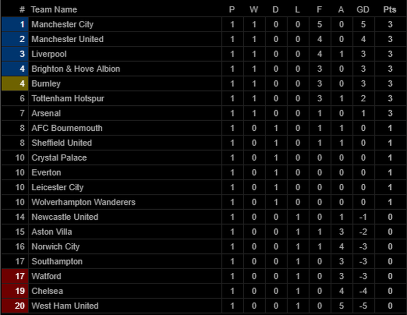 Bảng xếp hạng Premier League sau vòng 1, Chelsea đang ở vị trí áp chót. |