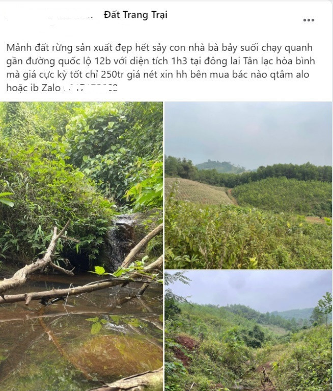 Chẳng hạn, 1,3ha đất rừng sản xuất ở Tân Lạc đang được rao bán giá 250 triệu đồng. Người bán không quên giới thiệu thêm lợi thế của mảnh đất khi có suối chạy quanh, gần đường quốc lộ 12B.