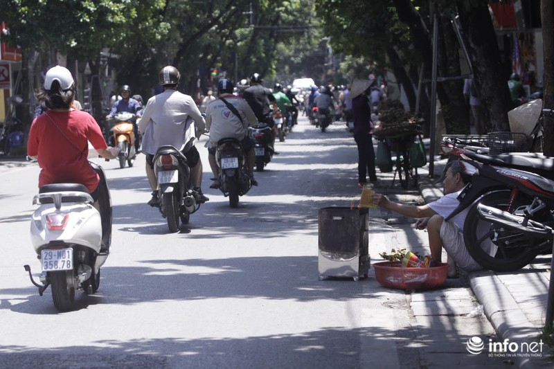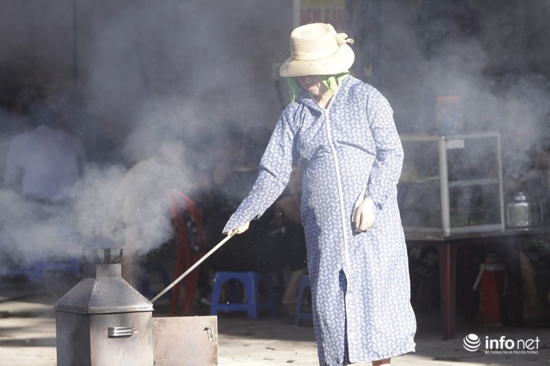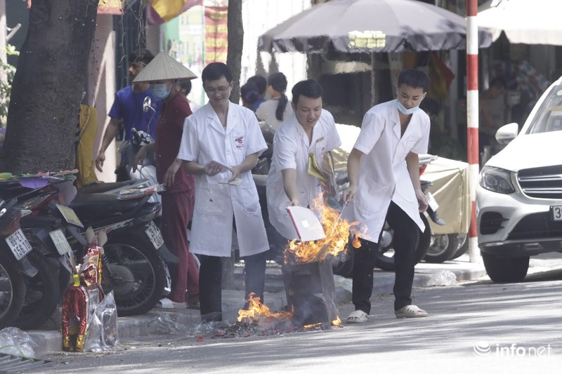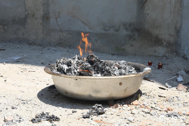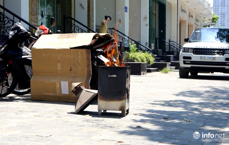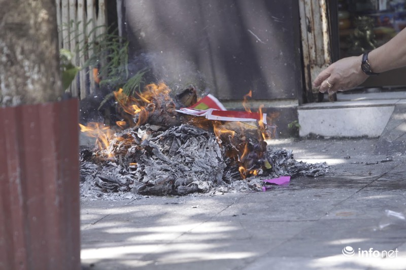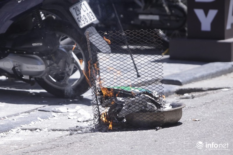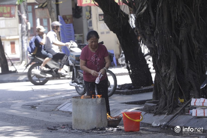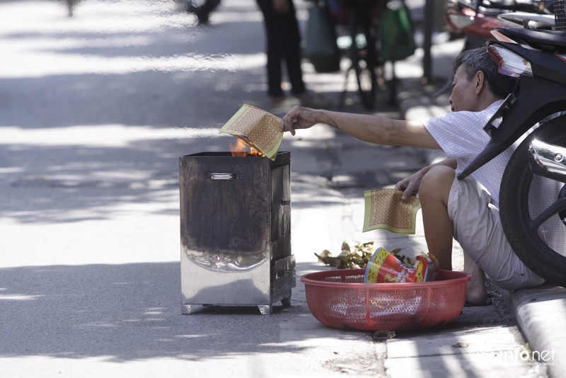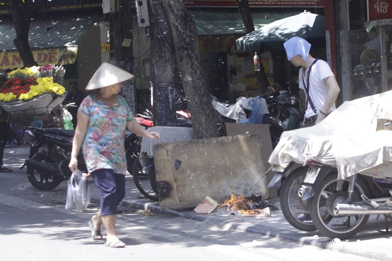 Nhiều người dân đốt vàng mã ở vỉa hè, khói bụi tàn nhang bay tứ tung. |
