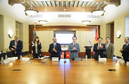 Lễ ký kết diễn ra tại Phòng Thương mại Mỹ dưới sự chứng kiến của Phó Thủ tướng Chính phủ Vương Đình Huệ. |