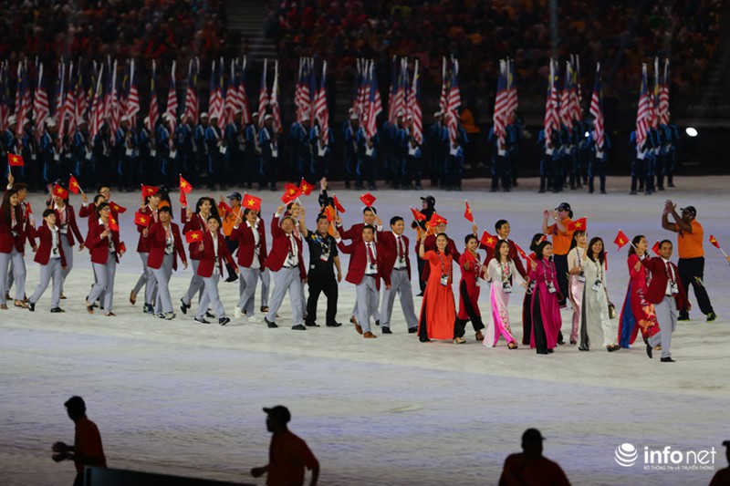 Kiếm thủ Vũ Thành An vinh dự được cầm Quốc kỳ dẫn đầu đoàn thể thao Việt Nam. Đoàn Việt Nam tham dự Đại hội lần này với 681 thành viên, trong đó có 471 VĐV, tranh tài ở 32/38 môn. Tính đến trước giờ khai mạc, Đoàn thể thao Việt Nam xếp thứ 7 với 3 HCB và 1 HCĐ. |