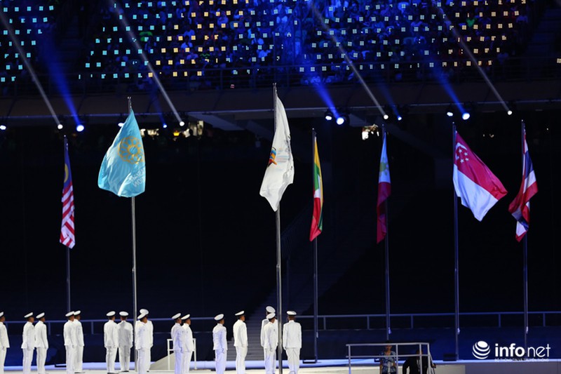 Lá cờ của SEA Games 29 cùng cờ của Liên đoàn Thể thao Đông Nam Á đã được các VĐV kỳ cựu của Malaysia rước qua lễ đài và sau đó là lễ thượng cờ do các chiến sỹ Hải quân Malaysia trang trọng tiến hành. |