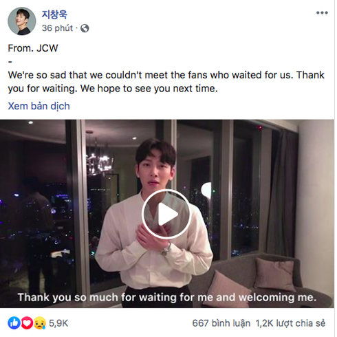 Trong đoạn video, Ji Chang Wook chia sẻ: "We're so sad that we couldn't meet the fans who waited for us. Thank you for waiting. We hope to see you next time ( Gửi lời cảm ơn fan Việt vì đã chờ đợi và chào đón anh ngày hôm nay. Anh rất buồn khi sự kiện bị hủy vì lý do an toàn. Hy vọng trong tương lai có thể gặp mọi người!)".