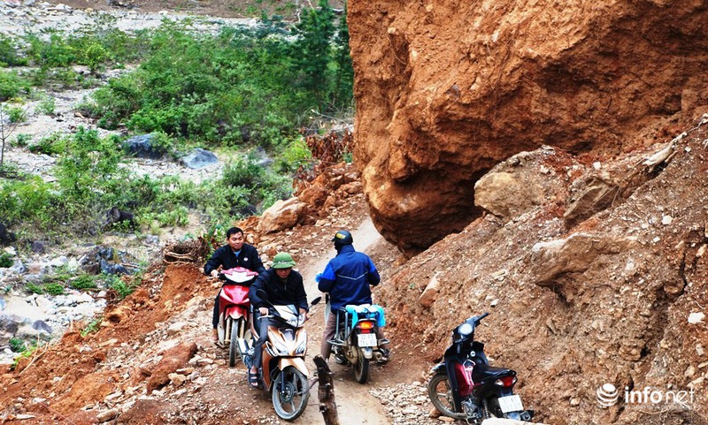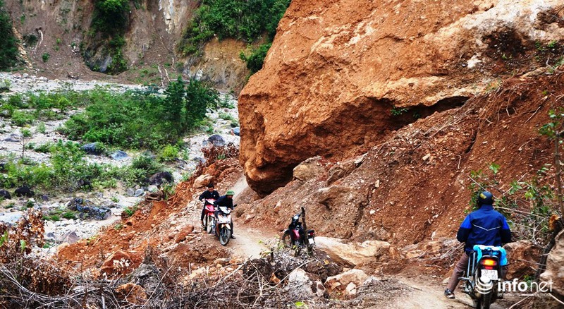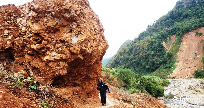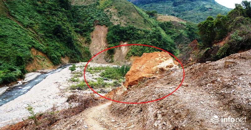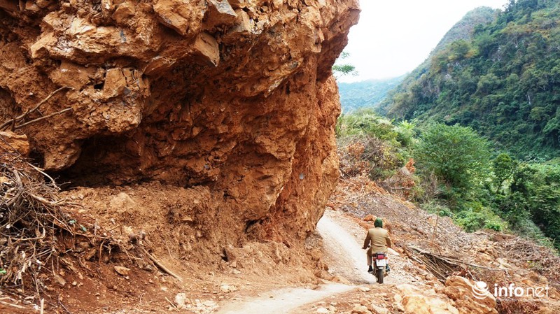 Sau những ngày nỗ lực khắc phục, con đường đã được thông tuyến nhưng cũng chỉ lọt đúng một chiếc xe máy đi qua do vướng phải hòn đá “khổng lồ” bị lở từ trên núi lăn xuống, dựng đứng chắn ngang con đường và đến nay chưa thể giải tỏa được.
