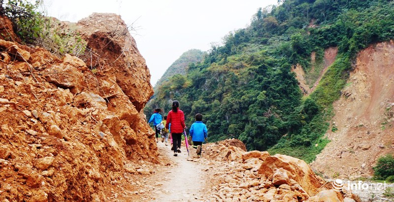 Nhiều người dân và các em học sinh mỗi khi phải đi qua cung đường “tử thần” này đều rùng mình khiếp sợ, vì hòn đá và hàng nghìn khối đất có thể đổ sập bất cứ lúc nào.