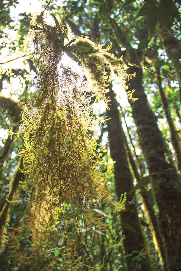 Giữa “rừng rêu”, nắng xen qua kẽ lá, chiếu lấp lánh trên những đám rêu còn đọng chút sương đêm khiến những giọt nước như “phát sáng”. Rêu phủ những thân cây một lớp dày xanh mượt từ gốc lên đến ngọn. Trên các cây lớn nằm ngang, những sợi rêu dài rũ xuống như tấm mành cửa của thiên nhiên đầy lãng mạn. Khung cảnh ấy đủ để chúng ta quên hết ồn ào nơi phố thị và hòa mình vào thiên nhiên xanh mướt; những cô gái trẻ thích khám phá mơ ước về bộ ảnh cưới được chụp giữa khung cảnh đẹp đến lặng người này.