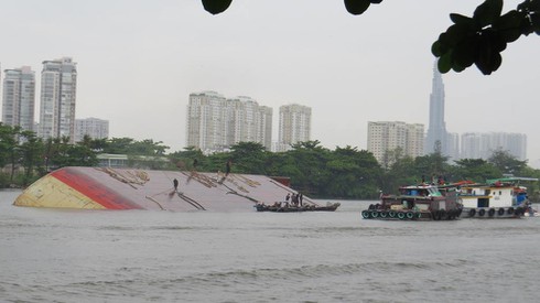 Sà lan hàng trăm tấn lật úp trên sông Sài Gòn