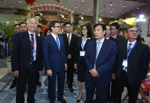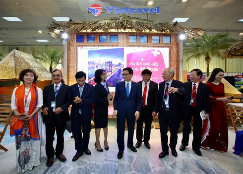 Phó Thủ tướng Vũ Đức Đam, Bộ trưởng Nguyễn Ngọc Thiện cùng các vị đại biểu tham quan gian hàng của Cty Du lịch Vietravel. |