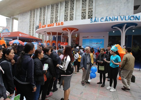 Khách tham quan xếp hàng mua vé máy bay giá rẻ. |