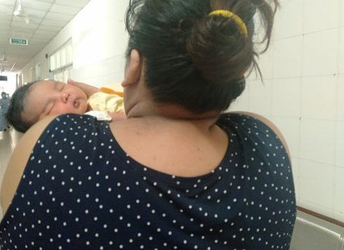 Quá trình chuyển dạ do đầu thai nhi không xoay xuống hoàn toàn, bác sĩ quyết định mổ sinh. Bé trai chào đời nặng 3,7 kg, viêm phổi, vàng da sơ sinh và nghi bị dạng nhẹ khớp háng. Bé được chuyển Khoa Sơ sinh để chăm sóc và khám vật lý trị liệu.