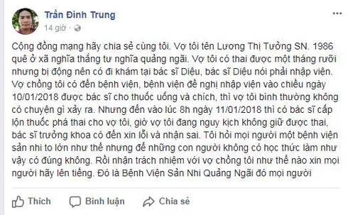 Anh Trung cho biết, vợ anh là sản phụ Lương Thị T. (sn 1986, ở xã Nghĩa Thắng, Tư Nghĩa, Quảng Ngãi) trưa 10/1, chị T. được người nhà đưa vào viện để dưỡng thai 6 tuần tuổi vì có dấu hiệu bị động thai. Tại đây, sau quy trình khám và chẩn đoán, chị T. được chỉ định nằm nội trú tại Khoa Phụ và được cấp thuốc dưỡng thai qua đường uống và đặt âm đạo. Đến chiều cùng ngày, sức khỏe của chị T. và thai nhi đều đã ổn định.