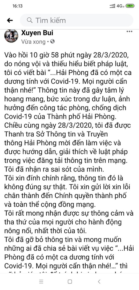 Vào khoảng 10h58' hôm nay (28/3), tài khoản facebook @xuyen.bui.10004 đã đăng thông tin: “Hải Phòng đã có một ca dương tính với Covid-19. Mọi người cẩn thận nhé!”.