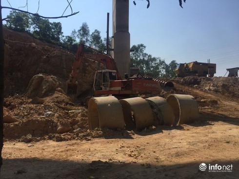 Những mảnh vụn bê tông còn sót lại đang được đơn vị thi công dùng đất lấp . Ảnh: Phạm Công |