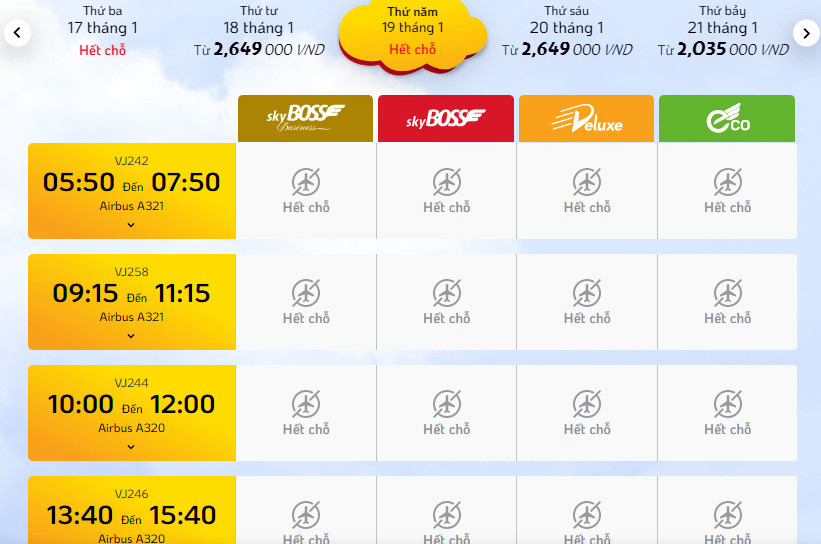Vietnam Airlines còn một số chuyến bay nhưng giá vé cao, từ 3,58 triệu đồng, riêng ngày 15/1 chỉ còn vé thương gia hơn 6 triệu đồng/chặng. Bamboo Airways ngày 15-16/1 còn một chuyến bay 6h sáng với vài chỗ, giá vé 4,3-5 triệu đồng, các ngày từ 17-19/1 đã hết nhẵn.