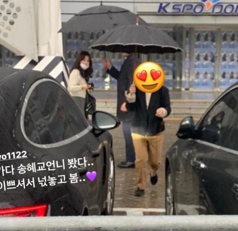 Ngày 24/11, một tài khoản trên mạng xã hội Twitter đã đăng tải hình ảnh ghi lại khoảnh khắc người này bất ngờ gặp Song Hye Kyo khi người đẹp có mặt bên ngoài sân vận động nơi đang diễn ra đêm nhạc của nữ ca sĩ IU. IU là một trong những nữ ca sĩ Hàn, một người em mà Song Hye Kyo vô cùng yêu mến.