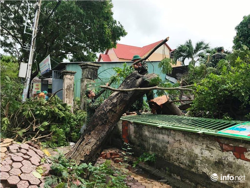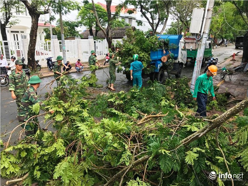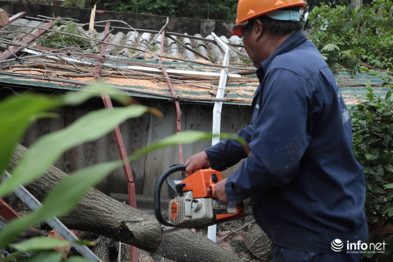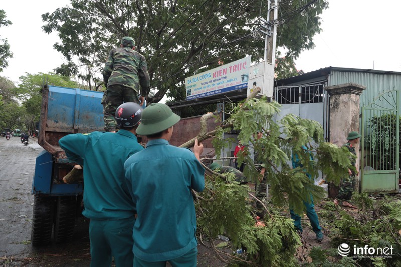 Lực lượng quân đội và dân quân dọn dẹp cây đổ cùng với nhân viên Công ty môi trường đô thị |
