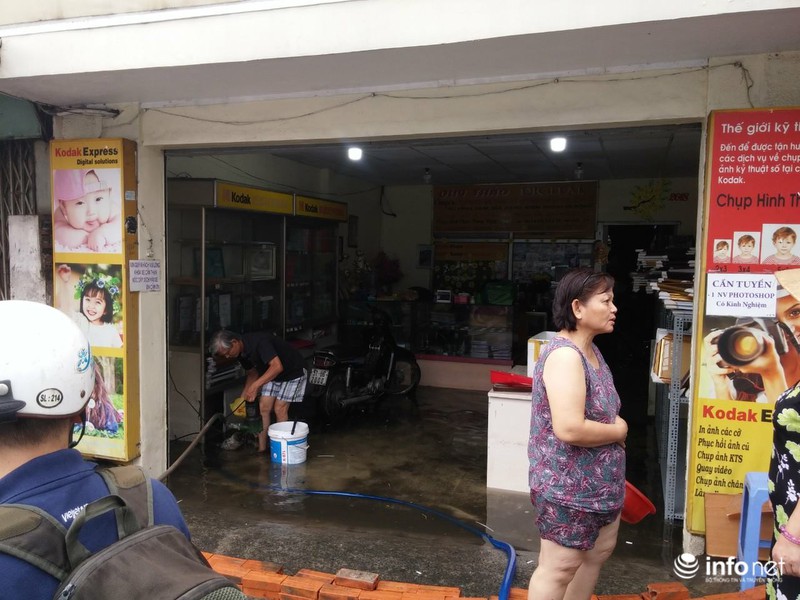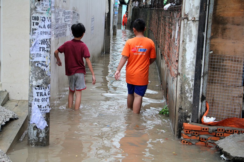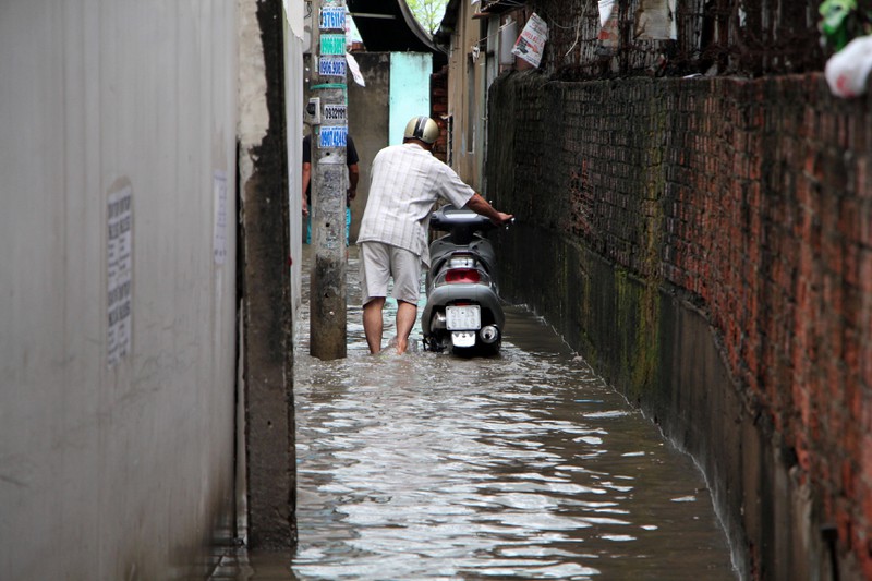 Do mặt đường được nâng cao khoảng 50cm so với trước đây nên nước đổ dồn vào các con hẻm, cộng với việc hệ thống thoát nước chưa hoàn thiện nên nhiều khu vực phía trong ngập lênh láng. |