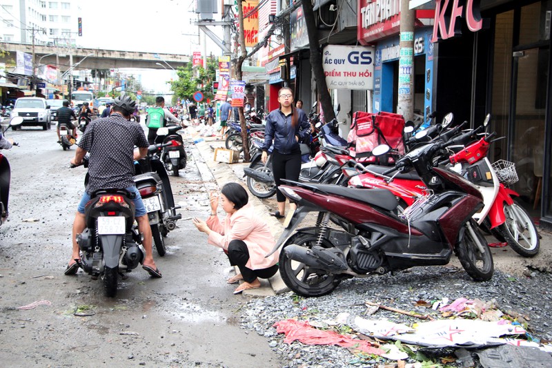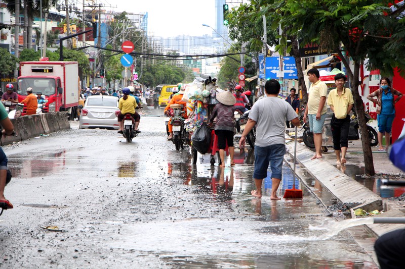 Tại đường Huỳnh Tấn Phát, quận 7 - một trong những con đường ngập nặng nhất trong những đợt mưa lũ - ngổn ngang đất đá. Do đang thi công dang dở nên đường rất lầy lội, ổ gà ổ trâu nhiều. Người dân phải mang dụng cụ ra dọn dẹp đoạn đường trước cửa nhà mình. |
