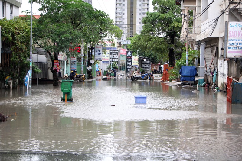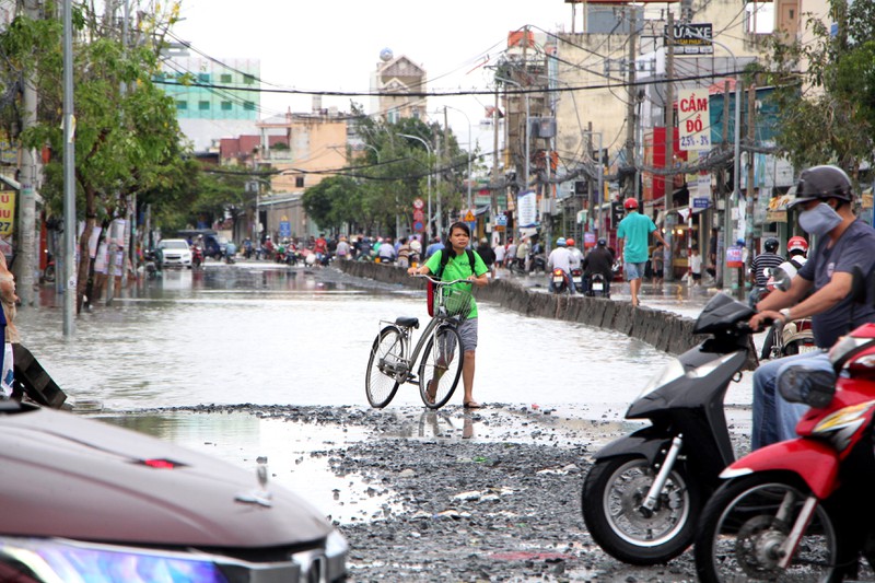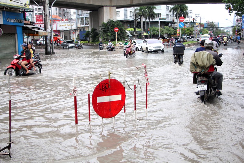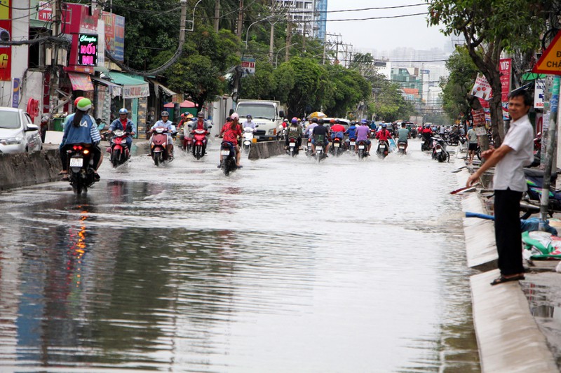 Một đoạn dù mới được nâng cao nhưng vẫn ngập trên đường Huỳnh Tấn Phát. Theo dự báo của Đài khí tượng thủy văn khu vực Nam bộ, hôm nay TP.HCM sẽ tiếp tục mưa dù vũ lượng không lớn như hôm qua. |