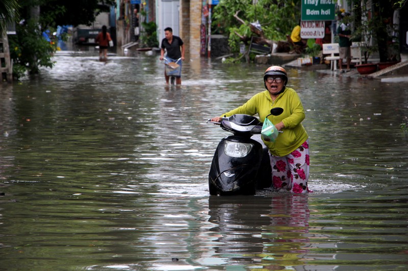 Dù ngập nhưng nhiều người vẫn phải lội bộ ra đường xử lý công việc |
