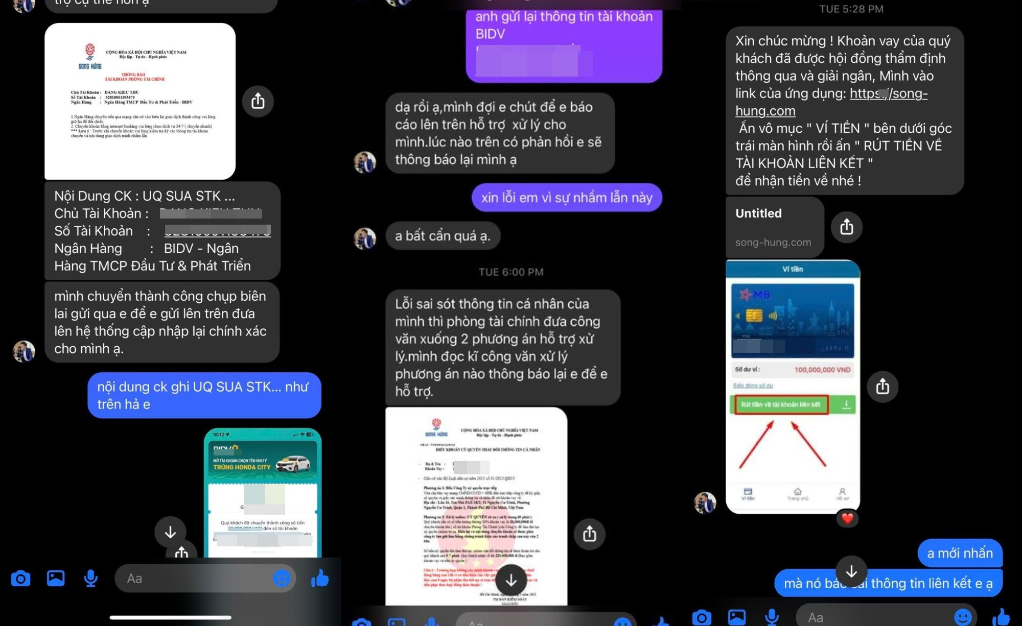 “Vậy là tôi đã chuyển liên tiếp 5 lần tiền (360 triệu đồng - nv) cho Song Hùng trên một tài khoản cá nhân. Mọi sự chỉ bừng tỉnh khi nhân vật thứ ba xuất hiện là anh trưởng phòng giải ngân.