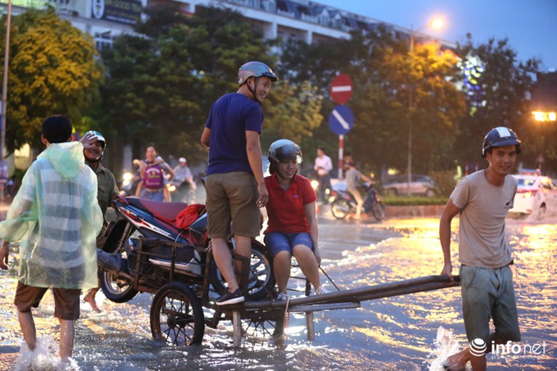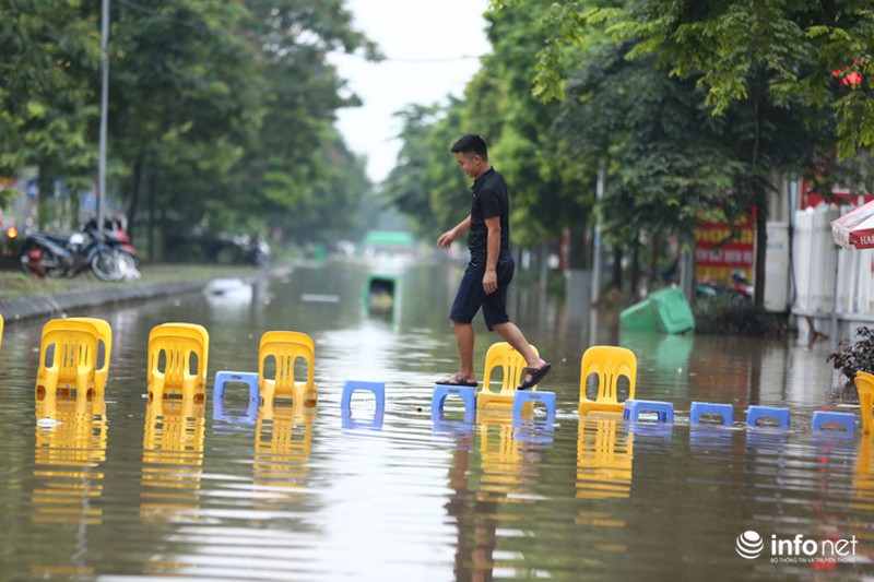 Trận mưa lớn ở Hà Nội sau nhiều ngày nhấn chìm nhiều tuyến phố của Hà Nội vào biển nước. Khu vực thiên đường Bảo Sơn có nhiều đoạn ngập sâu cả mét, người dân phải kê ghế làm cầu phao băng qua nước. |