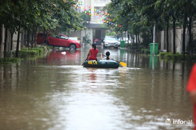 Tới chiều ngày 21/7, nhiều đoạn ngõ vào nhà tại khu vực thiên đường Bảo Sơn, Nam An Khánh vẫn ở trong tình trạng ngập úng, trẻ em dùng bè cao su để di chuyển trong khu vực. |