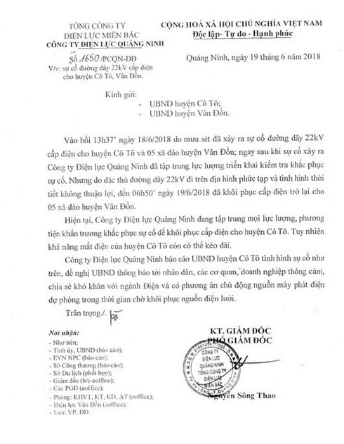 Theo thông báo của Công ty Điện lực Quảng Ninh, vào thời điểm 13h37 ngày 18/6, xảy ra sự cố sét đánh trúng đường dây truyền tải điện 22KV cấp điện cho huyện Cô Tô và 5 xã đảo của huyện Vân Đồn.