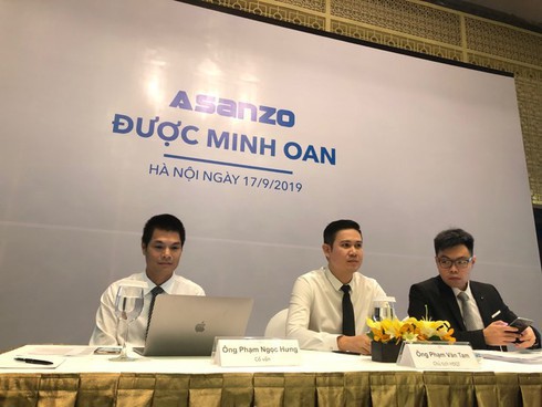 Chủ tịch Công ty CP Tập đoàn Asanzo- Phạm Văn Tam (giữa) chủ trì buổi họp báo tự minh oan ngày 17/9. |