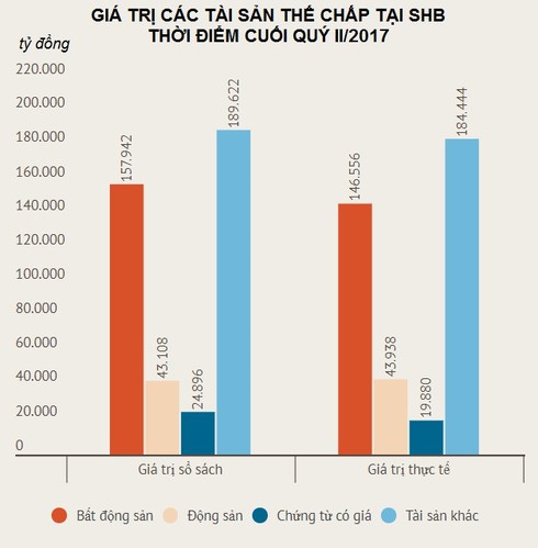Ngoài khối lượng lớn tài sản thế chấp là bất động sản, SHB cũng ghi nhận 43.108 tỷ đồng tài sản thế chấp là động sản, 24.896 tỷ đồng tài sản thế chấp là chứng từ có giá, và các tài sản khác là 189.622 tỷ đồng theo giá trị sổ sách.