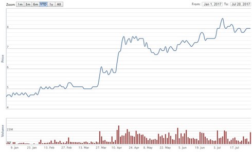 | Tính từ đầu năm 2017, cổ phiếu SHB đã tăng gần gấp đôi về thị giá từ mức hơn 4.000 đồng/cổ phiếu lên 8.000 đồng ở thời điểm hiện tại. Nguồn:Vndirect. |