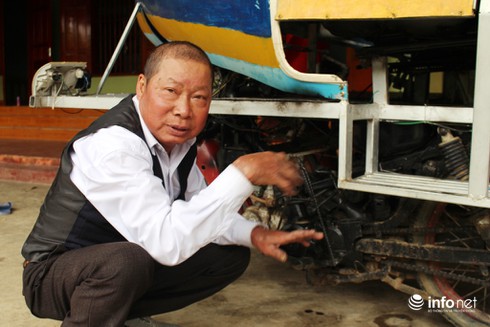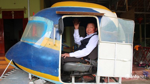 Điều đáng nói, các vật dụng được ông Duệ làm nên chiếc xe đều tận dụng từ nguồn ve chai mà gia đình thu mua về được. Chiếc xe có bộ khung bằng sắt, phần cabin như đầu một chiếc máy bay trực thăng.