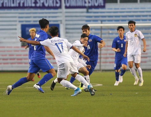 U22 Thái Lan (áo xanh) suốt 90 phút vẫn không thể ghi được bàn thắng khiU22 Lào đã có trận đấu đầy quả cảm. Ảnh VietNamNet. |