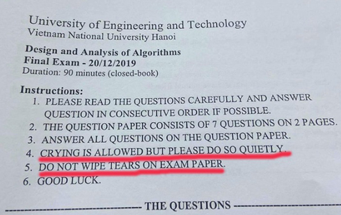 Cụ thể, ở ngay phần đầu của đề thi cuối kỳ này, giảng viên đã cẩn thận ghi hướng dẫn cho sinh viên: "Crying is allowed but please do so quietly. Do not wipe tears on exam paper (tạm dịch: Khóc cũng được nhưng nhỏ tiếng thôi. Không được lau nước mắt bằng giấy thi).