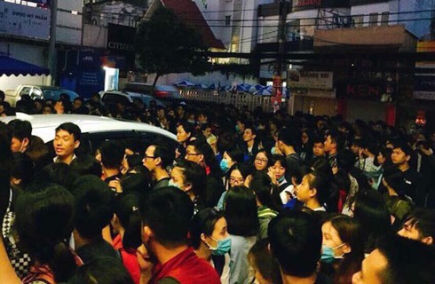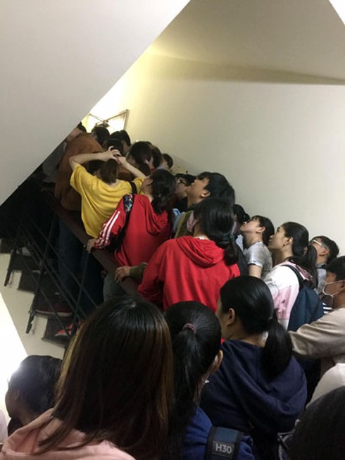 Sinh viên xếp hàng chật cứng trên cầu thang của trung tâm. Ảnh: FB Nguyen Duc. |