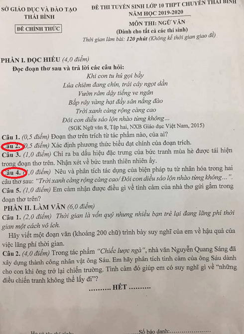 Câu hỏi trong đề thi môn Ngữ văn vào lớp 10 THPT chuyên Thái Bình được phản ánh "có sai sót" |