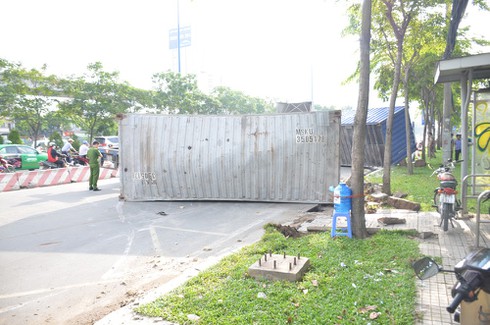 Một vụ thùng container rớt xuống đường trên Xa Lộ Hà Nội. |