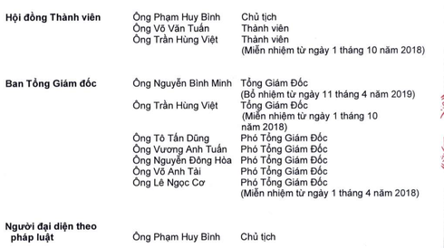 Sau khi miễn nhiệm Tổng giám đốc Trần Hùng Việt kể từ tháng 10/2018, đến tận tháng 4/2019 doanh nghiệp này mới có Tổng giám đốc mới là ông Nguyễn Bình Minh. Ngoài ông Minh, ban tổng giám đốc hiện có 03 phó tổng giám đốc.